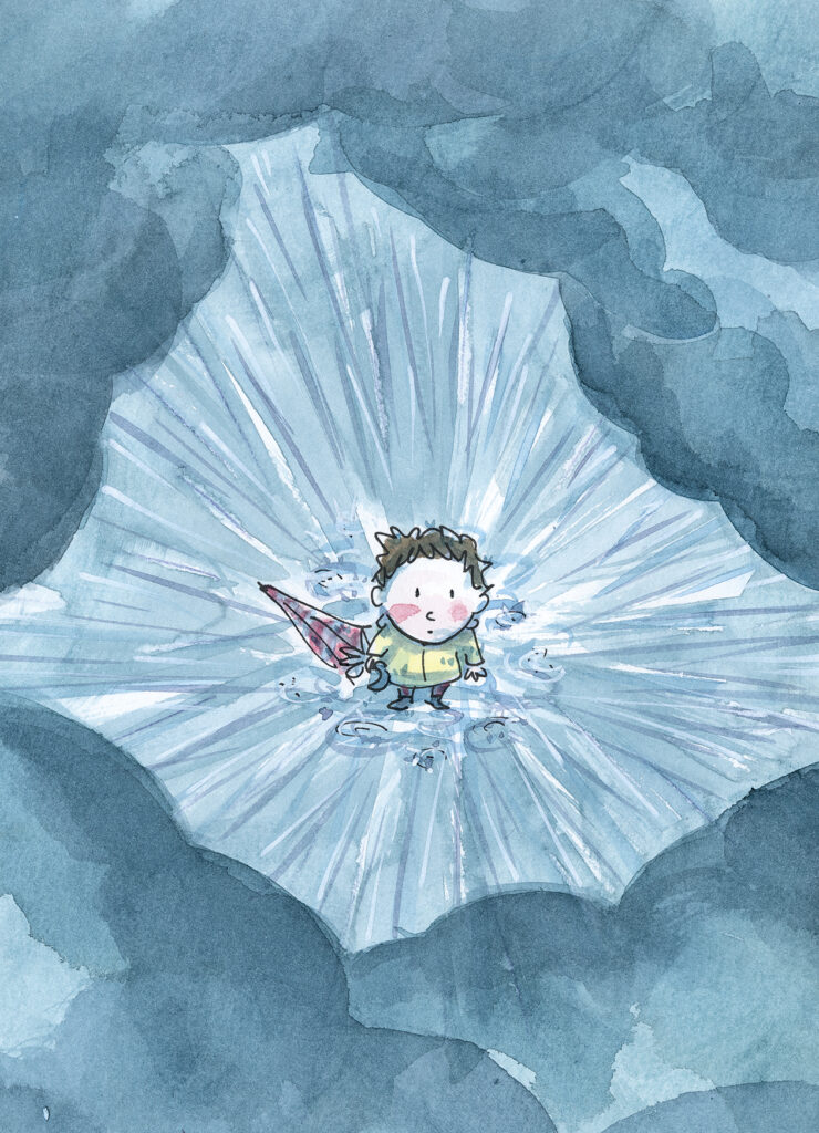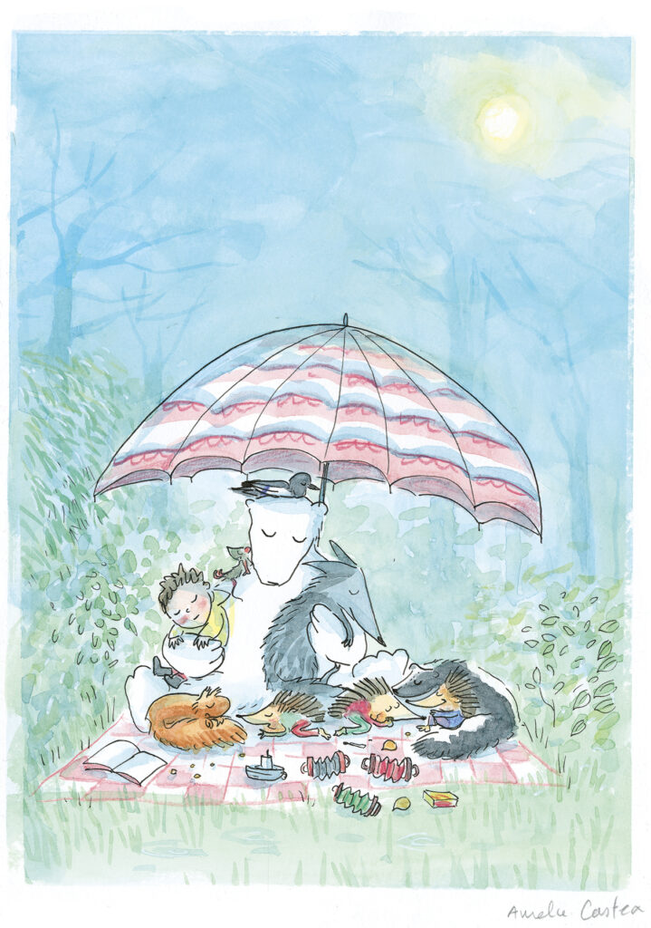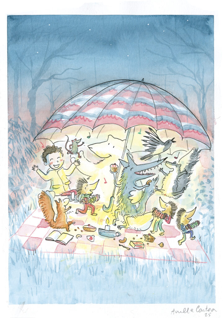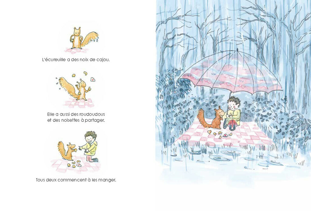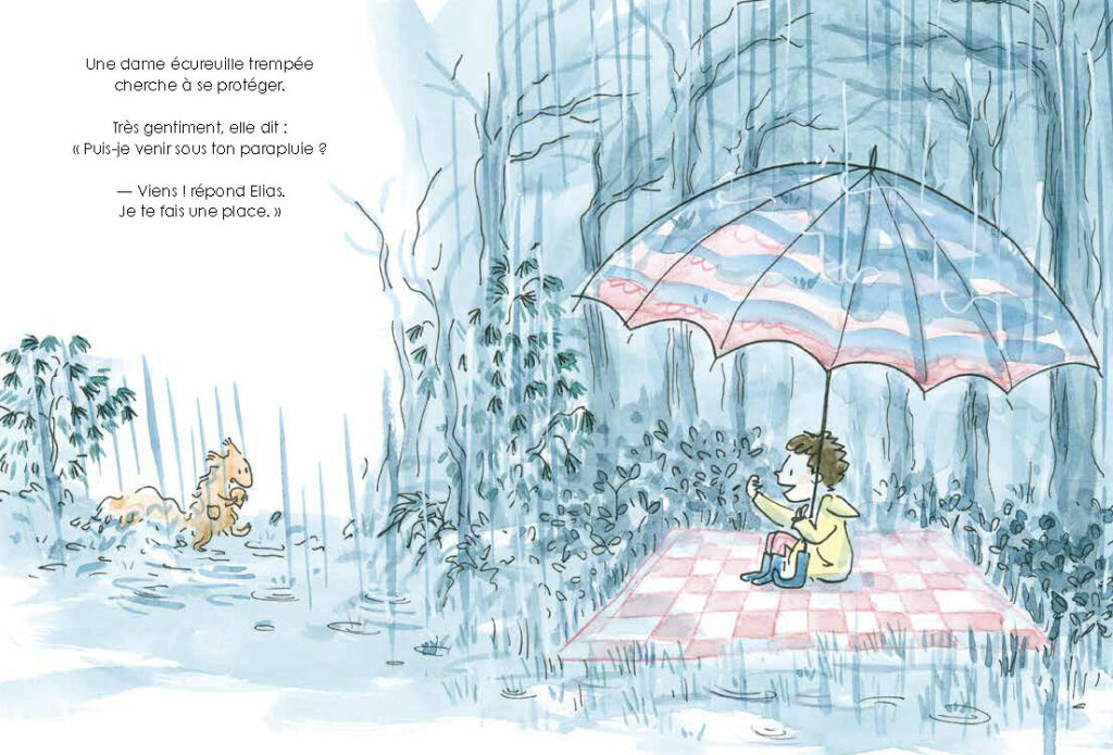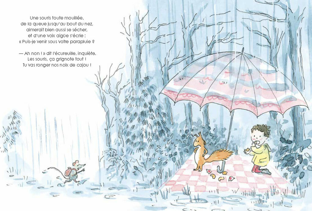 L’ABRIPARAPLUIEUn petit album à lire les jours de pluie, réalisé avec amour à l’aquarelle. Editions Seuil Jeunesse